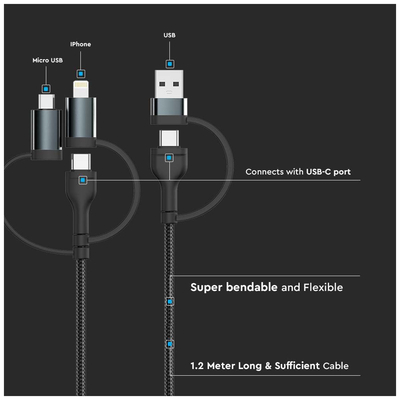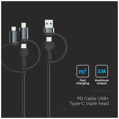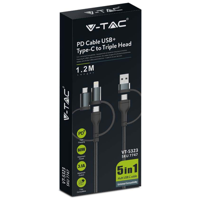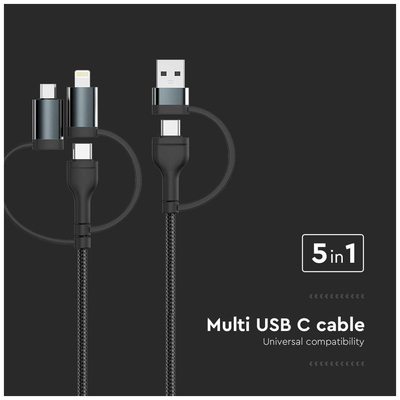 V-TAC Καλώδιο Φόρτισης 1.2m 5σε1 USB+Micro USB+Lightning+2 Type-C 3.1A 60W Max Γρήγορης Φόρτισης Μαύρο 7747