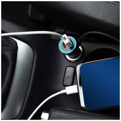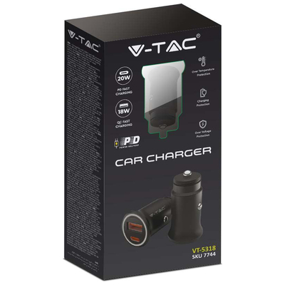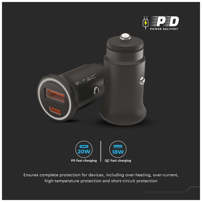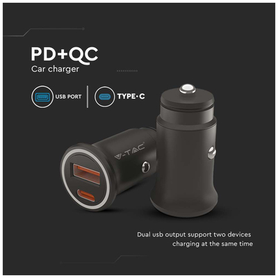 V-TAC Φορτιστής Αυτοκινήτου Μαύρος Συνολικής Έντασης 3A Γρήγορης Φόρτισης με Θύρες: 1xUSB 1xType-C