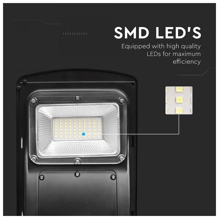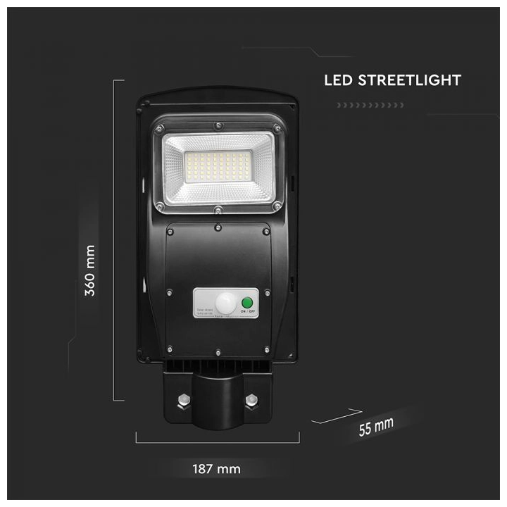 Με προστασία IP65 και μεταλλικό σώμα σε μαύρο χρώμα, το φωτιστικό έχει διαστάσεις 360x187x55 mm και είναι κατάλληλο για τοποθέτηση σε στύλο. Η διάρκεια ζωής φτάνει τις 20.000 ώρες και υποστηρίζει πάνω από 50.000 κύκλους On/Off.