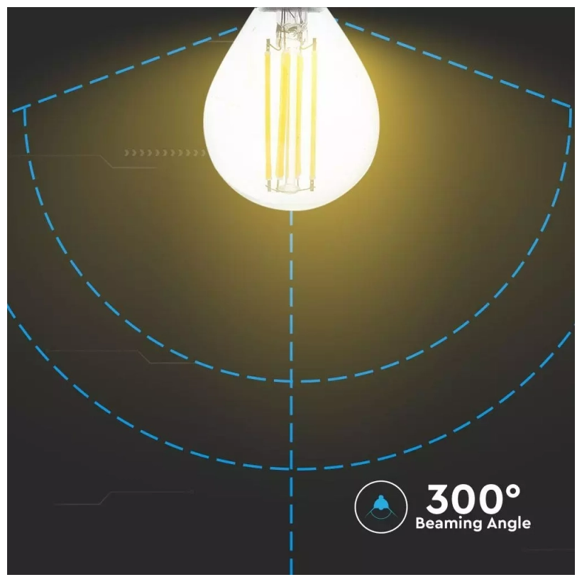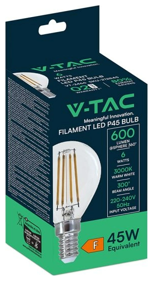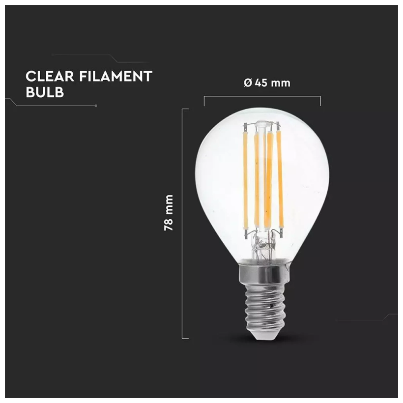Η λάμπα LED V-TAC E14 4W προσφέρει 400 lumen με ευρύ φασματικό εύρος 300°, εκπεμπώντας λευκό φυσικό φως 4000K. Το σχήμα P45 και το διαφανές γυάλινο περίβλημα με φιλοφίλαμετρο LED συνδυάζουν κλασική αισθητική με σύγχρονη τεχνολογία φωτισμού.