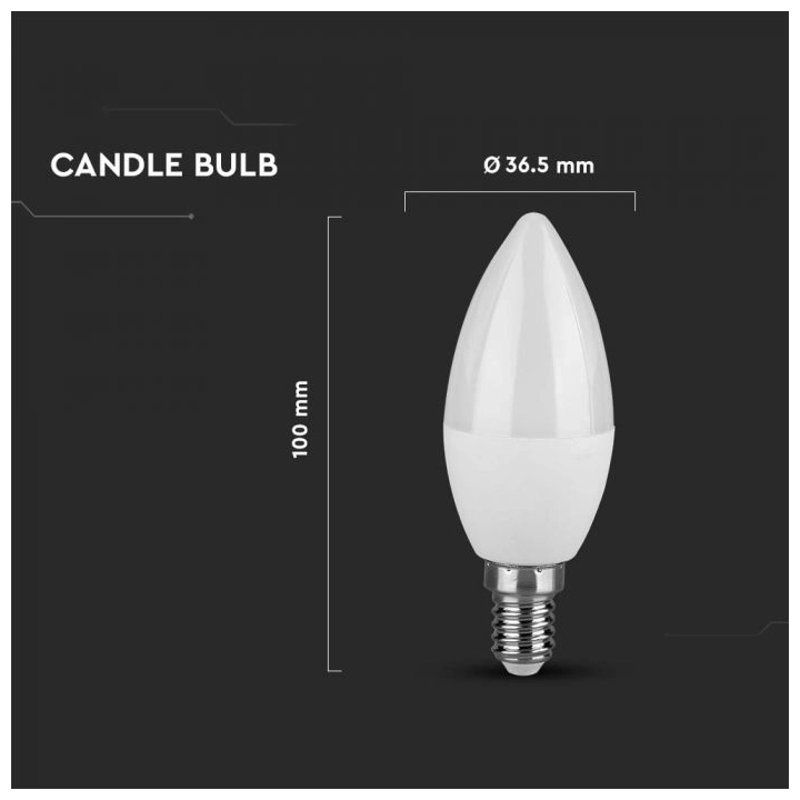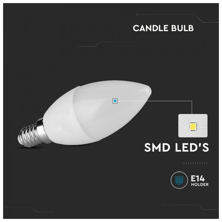 Με σώμα τύπου "κεράκι" και βάση E14, η λάμπα εφαρμόζει τέλεια σε φωτιστικά πολυελαίων, πορτατίφ και επιτοίχιων. Είναι κατασκευασμένη από ανθεκτική θερμοπλαστική με ματ (οπάλ) φινίρισμα, για διακριτική και ομοιόμορφη διάχυση φωτός.