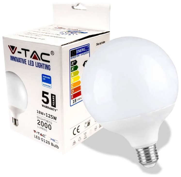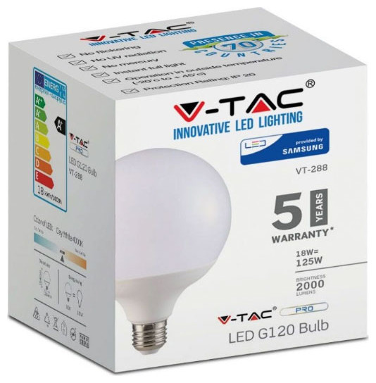 V-TAC Λάμπα Led E27 G120 18W 230V 200° 2000lm IP20 Samsung Chip Ψυχρό Λευκό - SKU: 21125