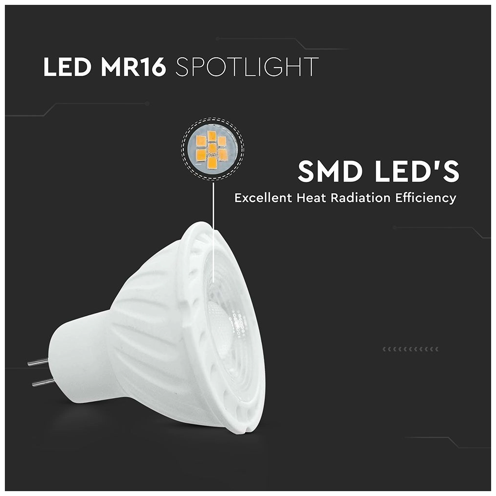 Η V-TAC MR16 LED 6W προσφέρει 455 lumen φωτεινότητας και θερμοκρασία 4000K, αποδίδοντας καθαρό και ξεκούραστο φυσικό λευκό φως. Με γωνία φωτισμού 110° και δείκτη χρωματικής απόδοσης >80, αποτελεί ιδανική επιλογή για στοχευμένο φωτισμό σε βιτρίνες, κουζίνες, μπάνια ή χώρους ανάγνωσης.