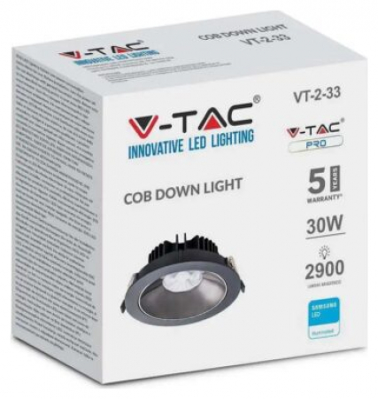 LED φωτιστικό οροφής χωνευτό στρογγυλό Samsung COB reflector φυσικό λευκό 30W 4000K με μαύρο σώμα V-TAC SKU: 2120058
