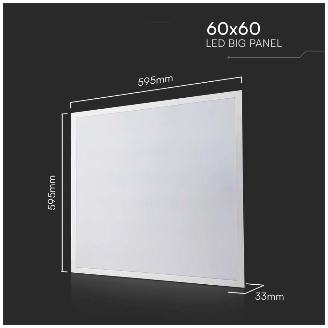 Το πάνελ έχει τετράγωνο σχήμα με διαστάσεις 595x595x33 mm και προστασία IP20, κατάλληλο για εσωτερική χρήση. Ο ενσωματωμένος driver προσφέρει σταθερή απόδοση, ενώ ο δείκτης απόδοσης χρώματος CRI >80 εξασφαλίζει φυσική αναπαράσταση χρωμάτων.