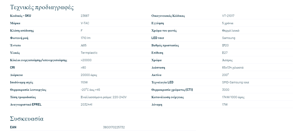 V-TAC PRO LED τσιπ λαμπτήρα Samsung E27 17W A65 3000K - SKU 23687