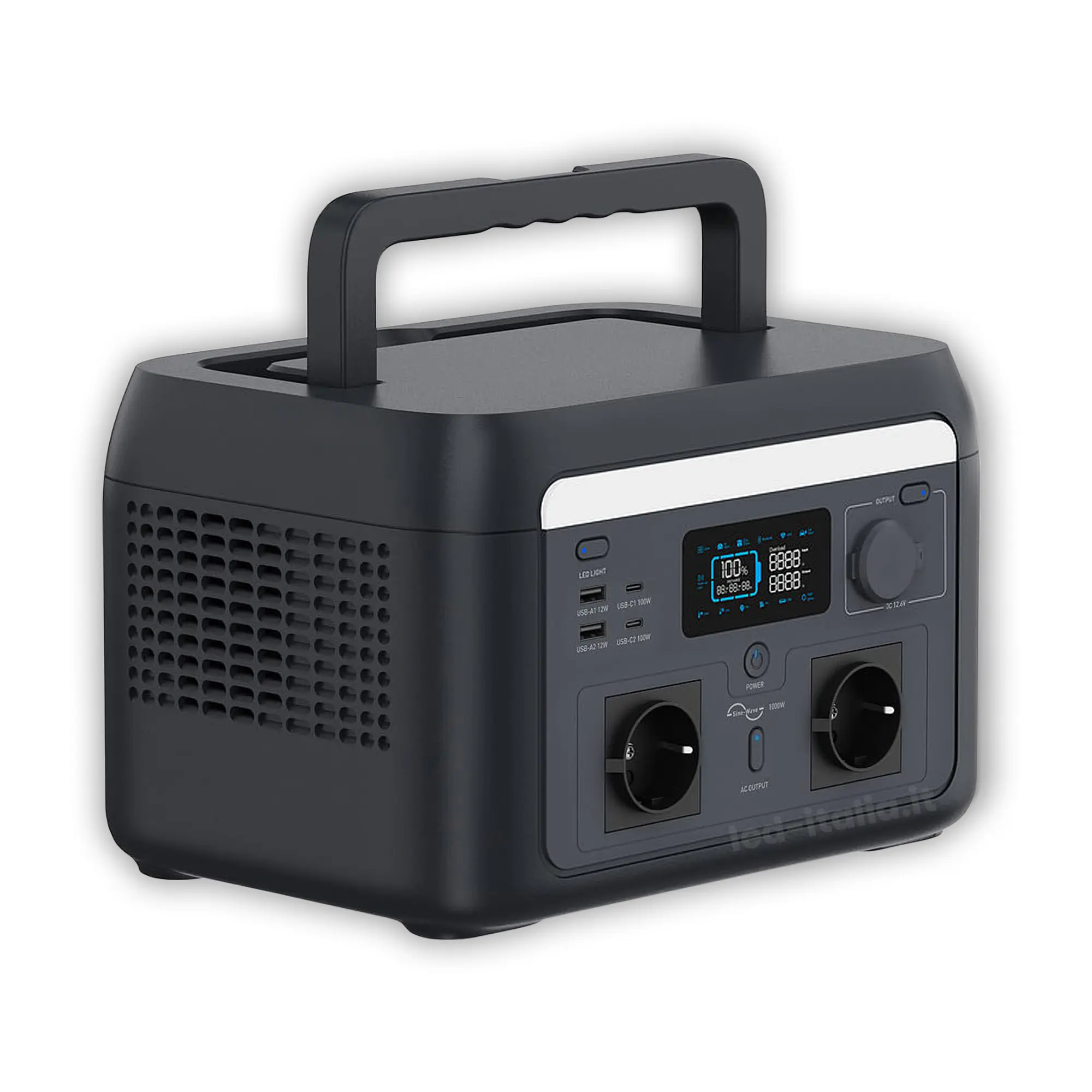 Με ονομαστική ισχύ εξόδου 1000W και κορύφωση (peak) έως τα 1600W, ο σταθμός παρέχει καθαρό ημίτονο (Pure Sine Wave), εγγυώμενος τη σταθερή και ασφαλή τροφοδοσία ευαίσθητων ηλεκτρονικών συσκευών και μικρών οικιακών συσκευών. Διαθέτει 2 εξόδους Schuko, θύρες USB-A και USB-C, καθιστώντας τον ένα πολυεργαλείο ενέργειας ιδανικό για το σπίτι, το κάμπινγκ, το τροχόσπιτο ή το εργοτάξιο, ενώ η στιβαρή λαβή μεταφοράς διευκολύνει τη μετακίνησή του.